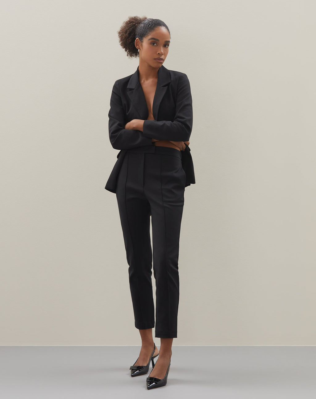 Calça Slim Alfaiataria Essential, perfeita para um look elegante no trabalho ou casual. Com cintura alta e comprimento cropped, essa peça clássica e atemporal é um curinga no closet.