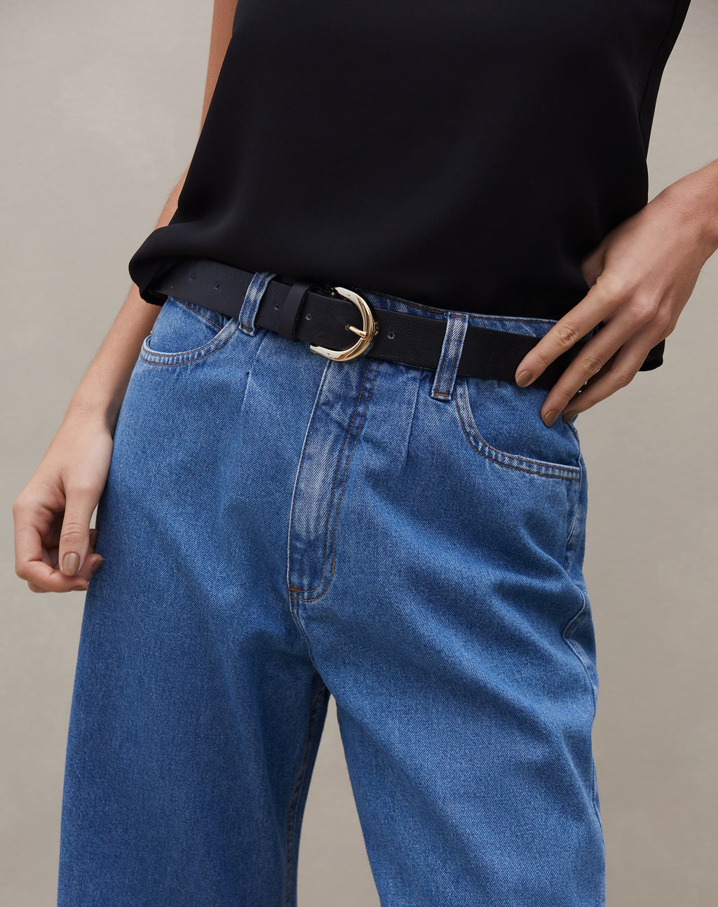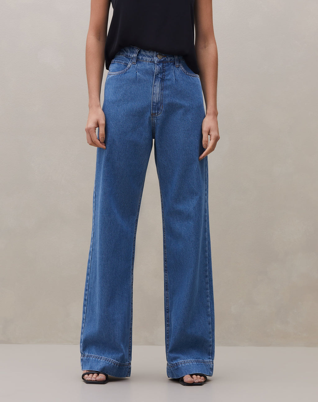 Calça jeans wide leg com pregas, perfeita para um look casual chic. O design moderno e elegante destaca-se, proporcionando um visual sofisticado e despojado ao mesmo tempo.