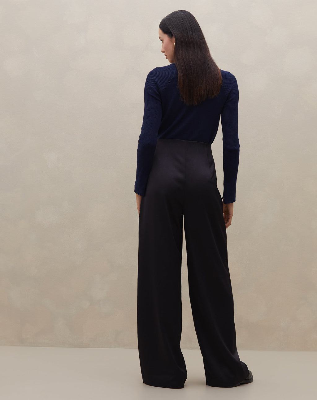 Calça wide com pregas no cós, ideal para um look elegante no trabalho ou em eventos noturnos. O design alfaitaria e cintura alta garantem sofisticação e conforto.