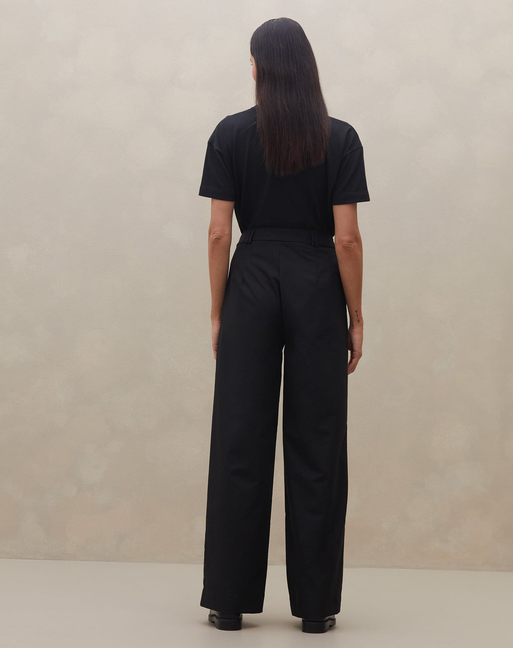 Calça wide com passante duplo, perfeita para um look elegante e moderno. Feita em crepe, possui cintura alta e comprimento longo. Ideal para diversas ocasiões, do trabalho ao happy hour.