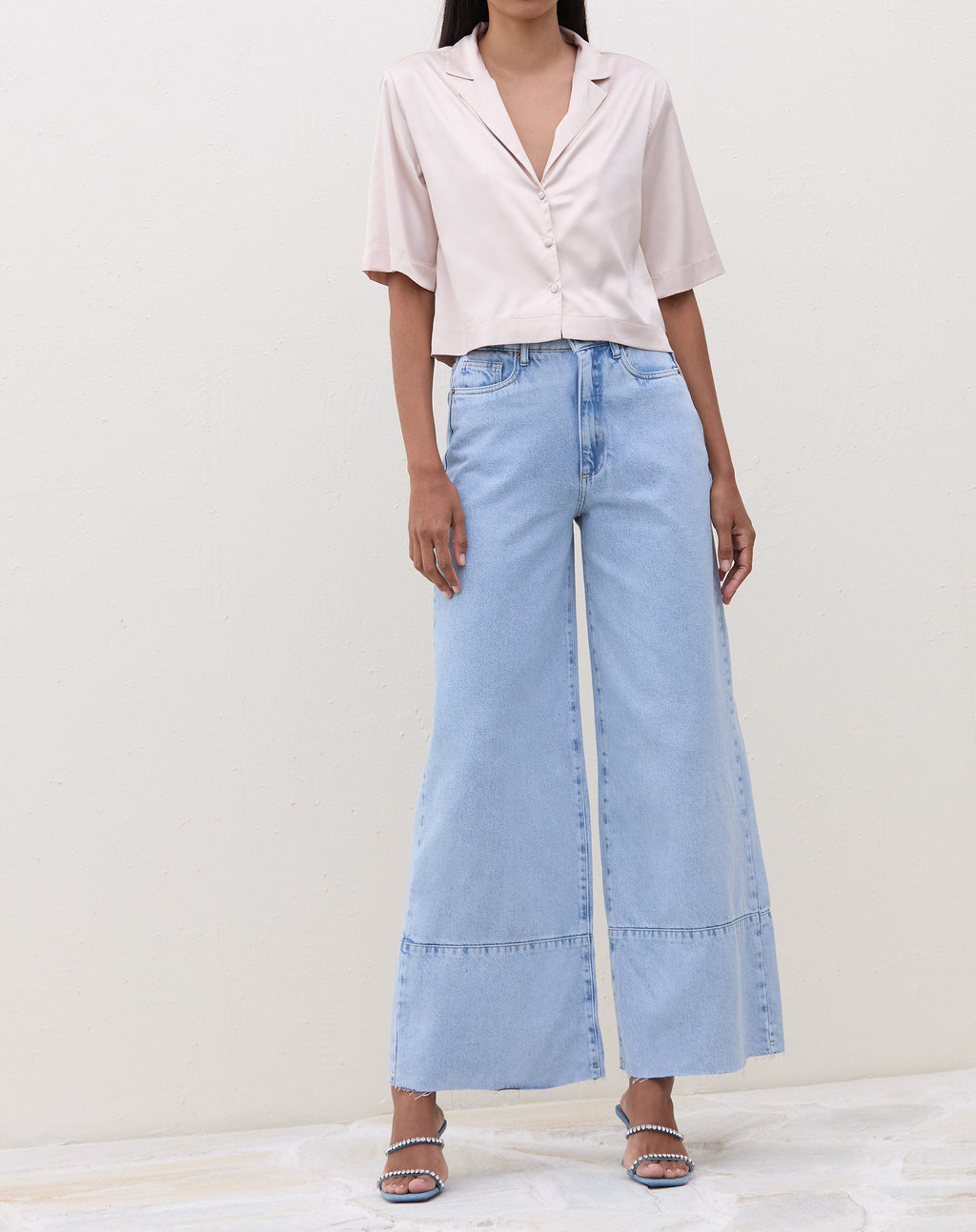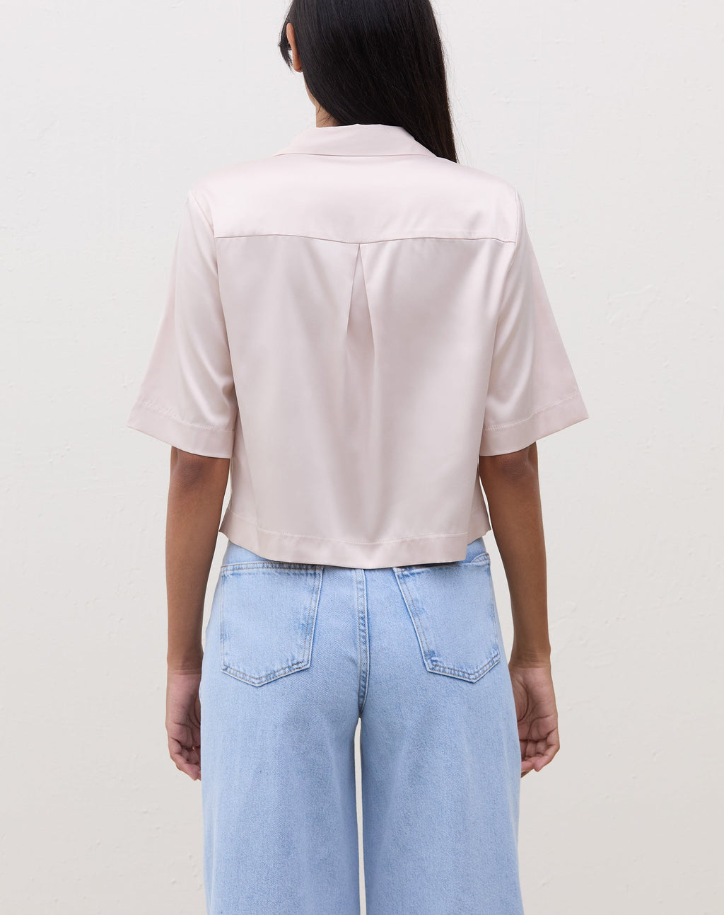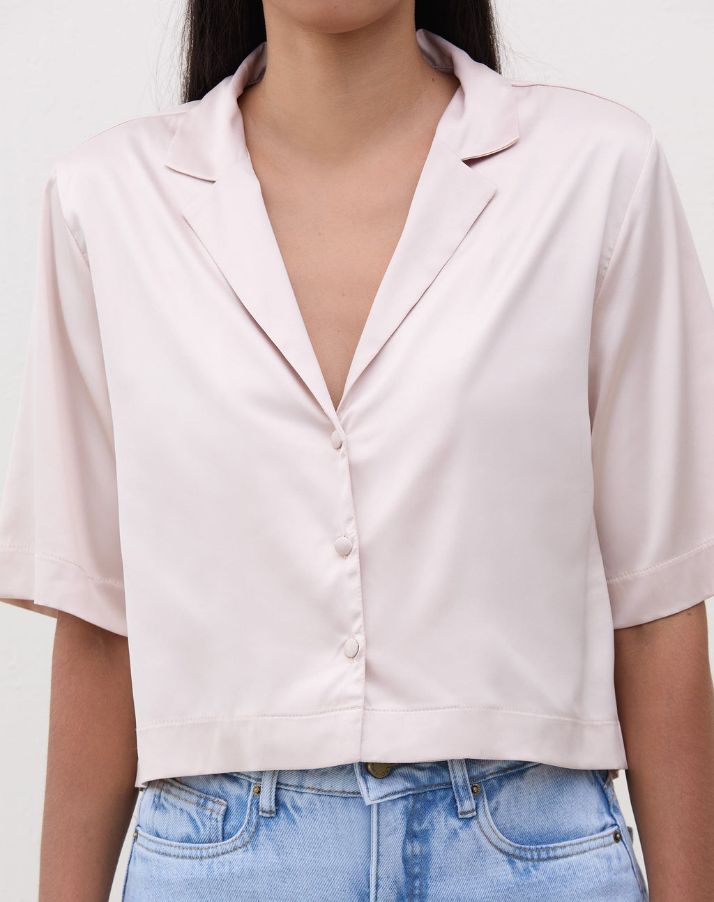 Camisa Cropped em cetim, manga curta, perfeita para um look versátil e moderno. Combine com calça de cintura alta para um visual elegante e descolado.