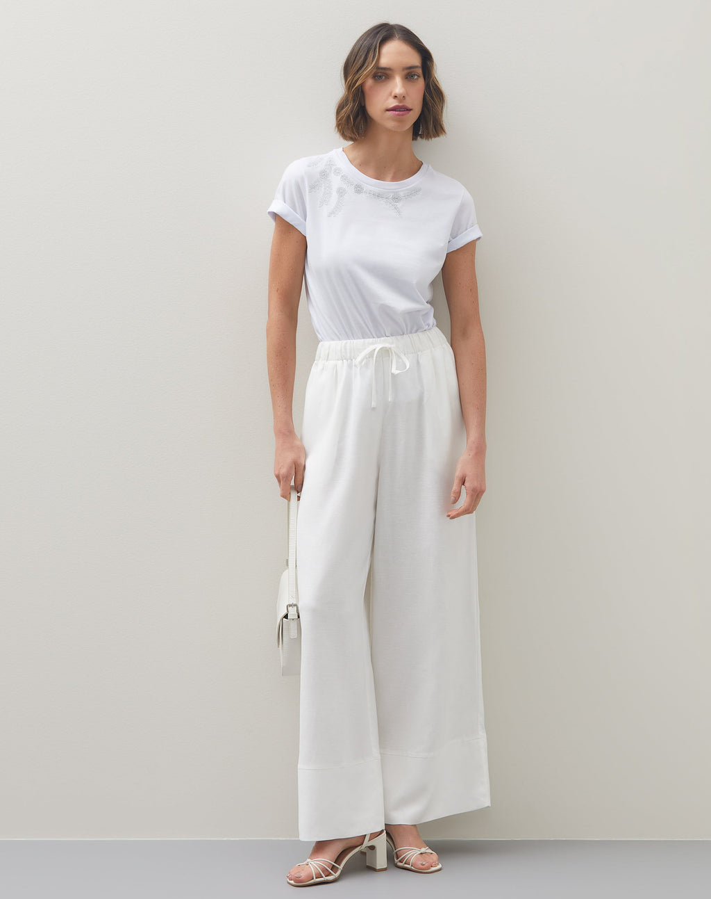 Camiseta clássica com bordado no ombro e decote, perfeita para um look casual elegante. Destaque para os detalhes em bordado que adicionam sofisticação ao visual.