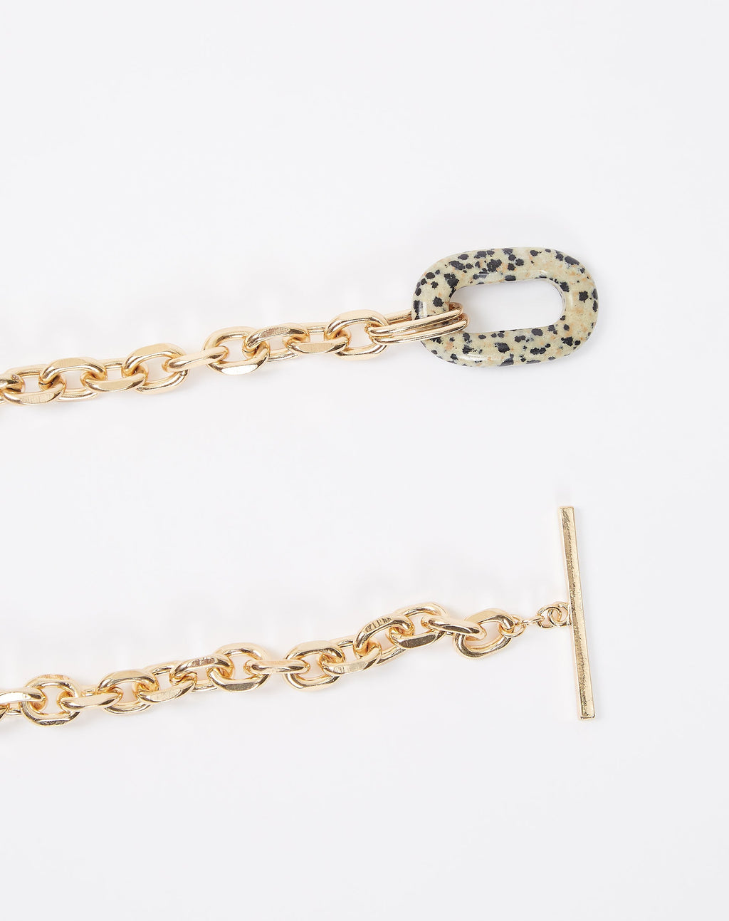 COLAR CORRENTE COM ELO DE PEDRA SEMI PRECIOSA;é o acessório elegante que a gente adora. Feito de metal, o colar tem comprimento médio e é uma bijoux.;