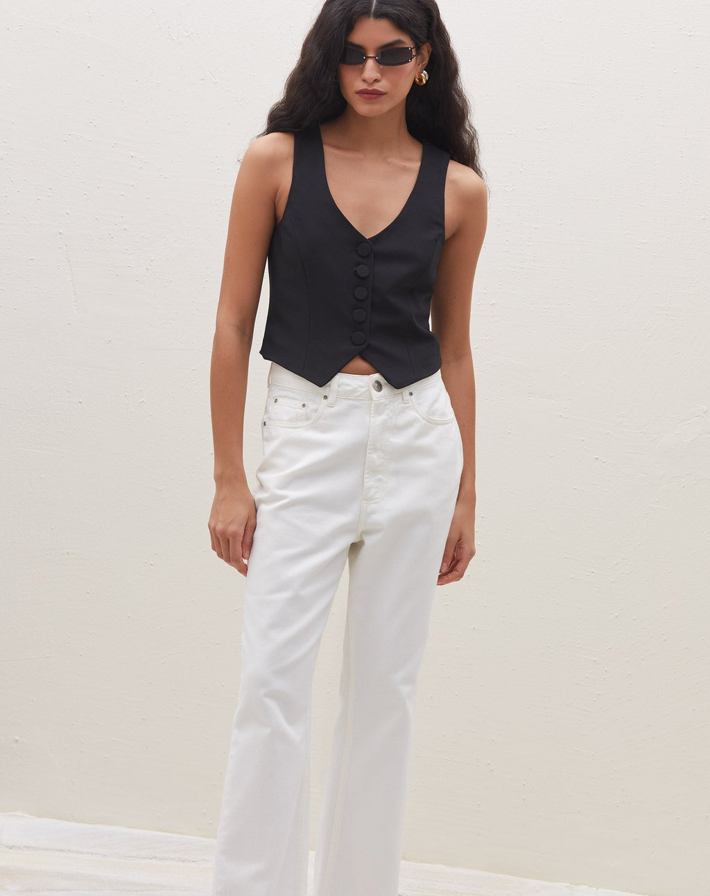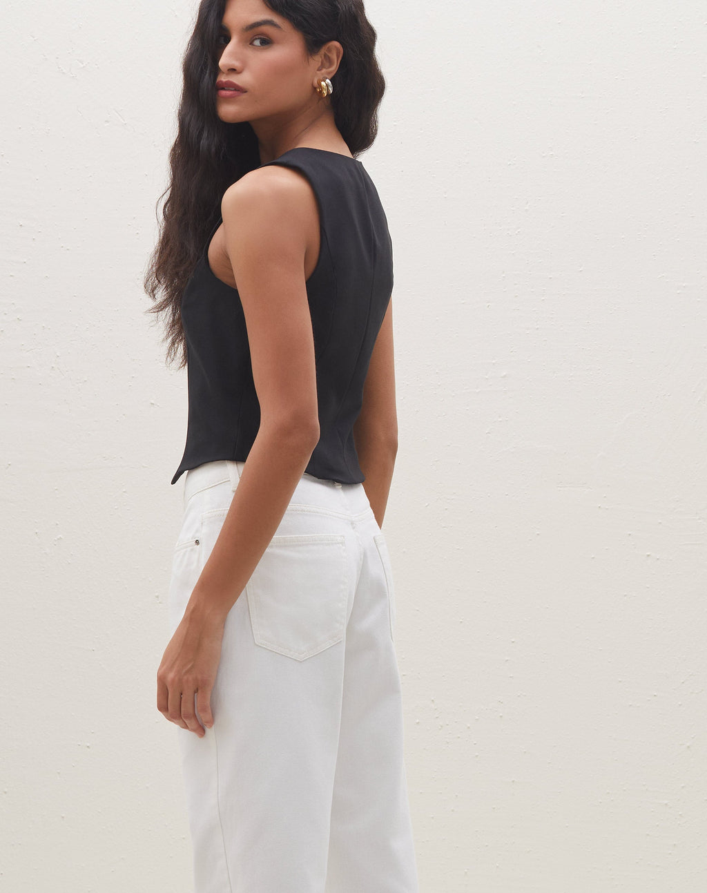 Destaque-se com o Colete de Alfaiataria com Botão Forrado, peça clássica e urbana perfeita para o trabalho ou momentos casuais. Seu design acinturado e curto, sem mangas e decote V, traz elegância e versatilidade ao seu look.