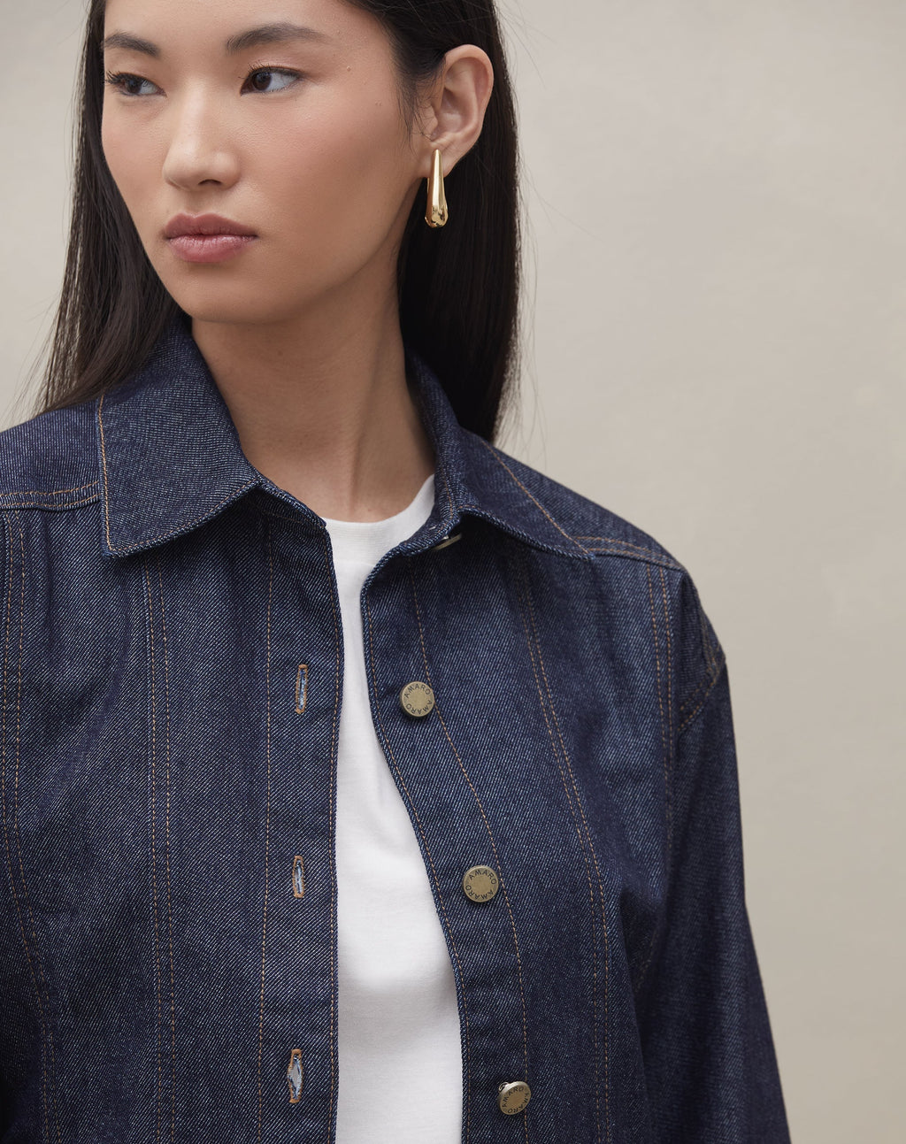 Jaqueta acinturada jeans, perfeita para um look casual chic. Destaque para o corte acinturado e a gola polo, garantindo um visual moderno e elegante.