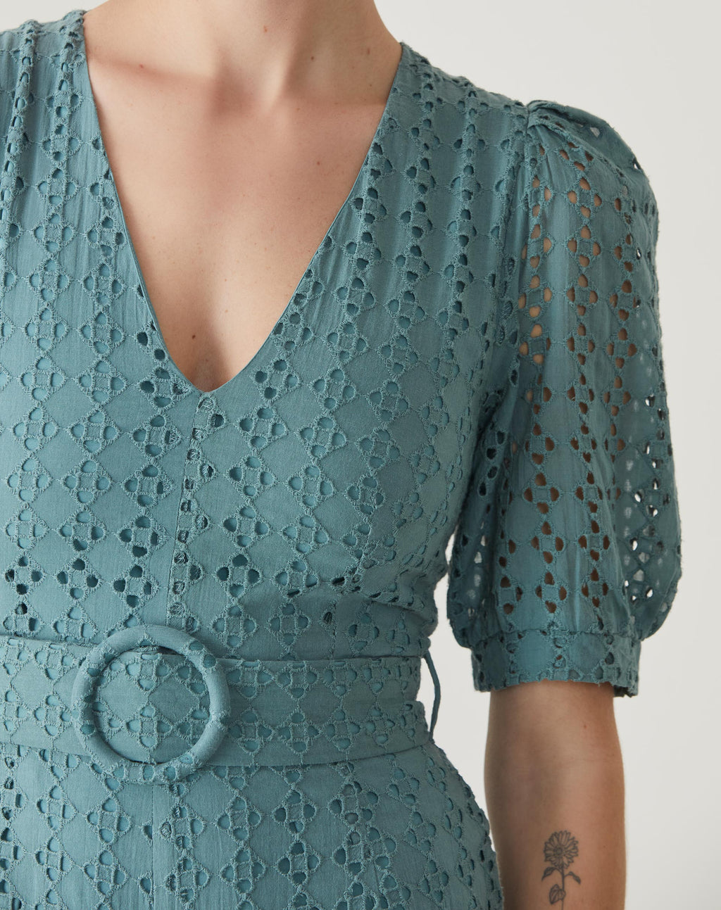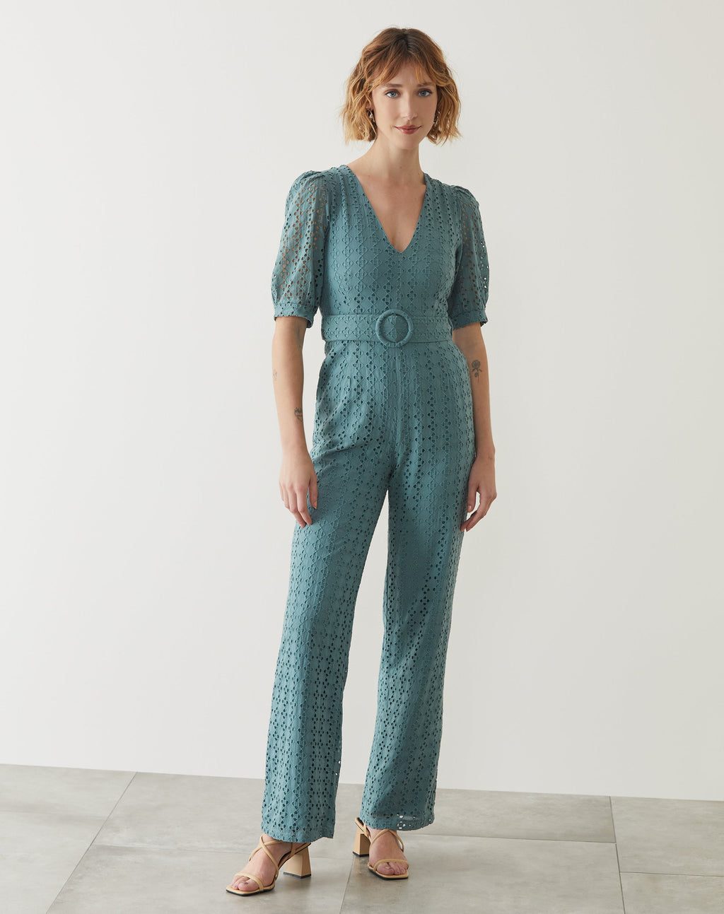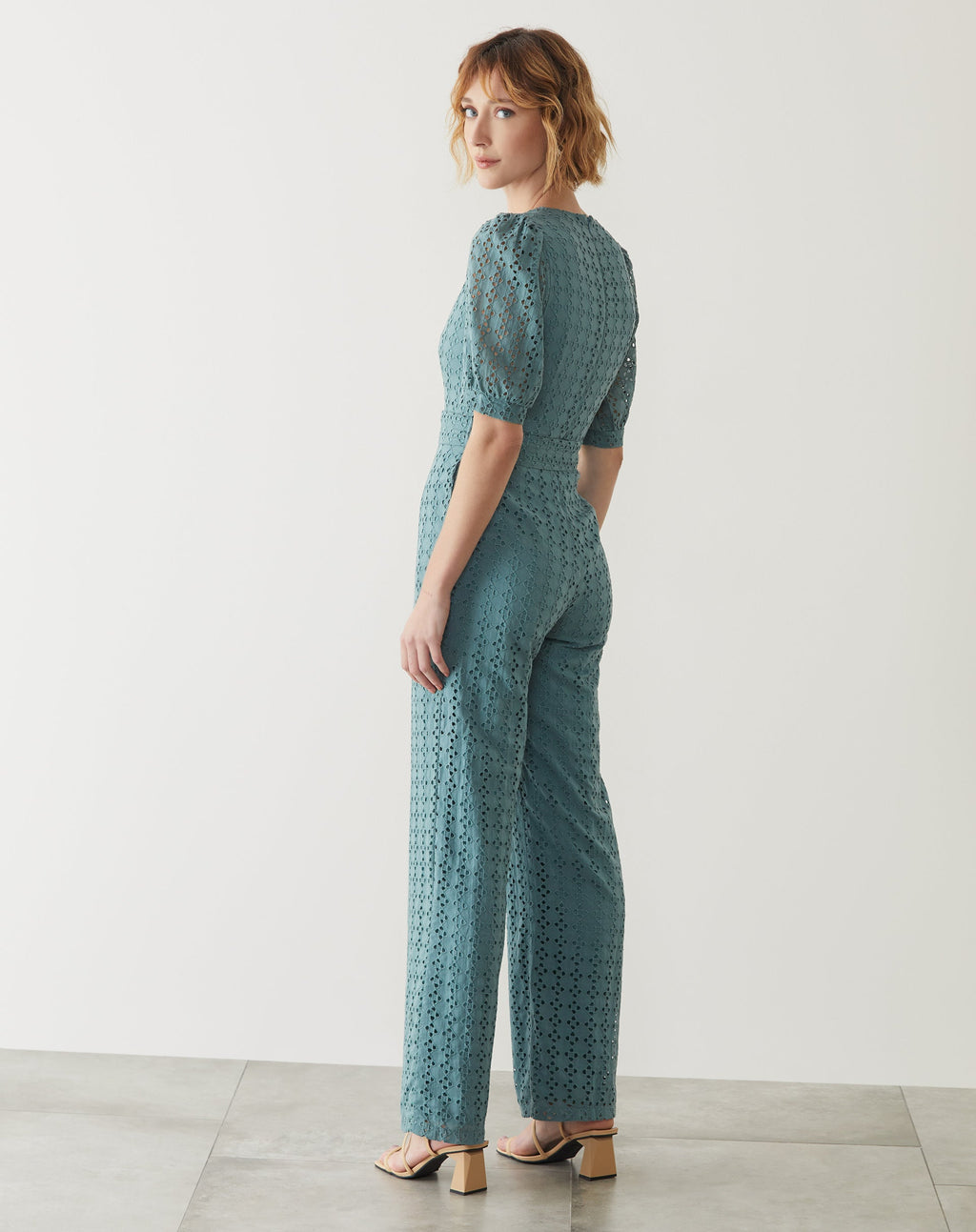 Macacão de laise com manga 3/4 e decote profundo, perfeito para um look casual elegante. O design clássico e o comprimento longo garantem sofisticação e conforto em qualquer ocasião.