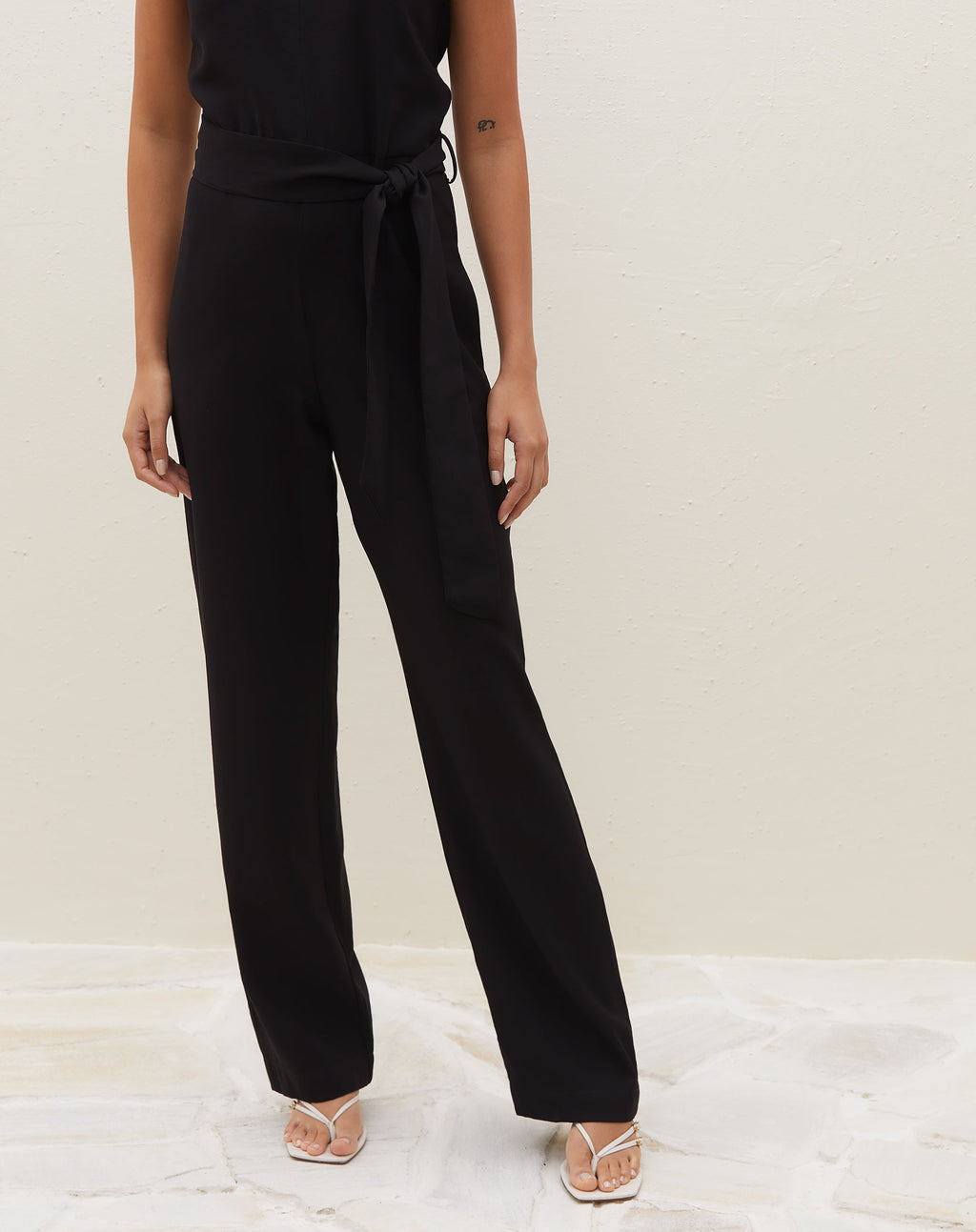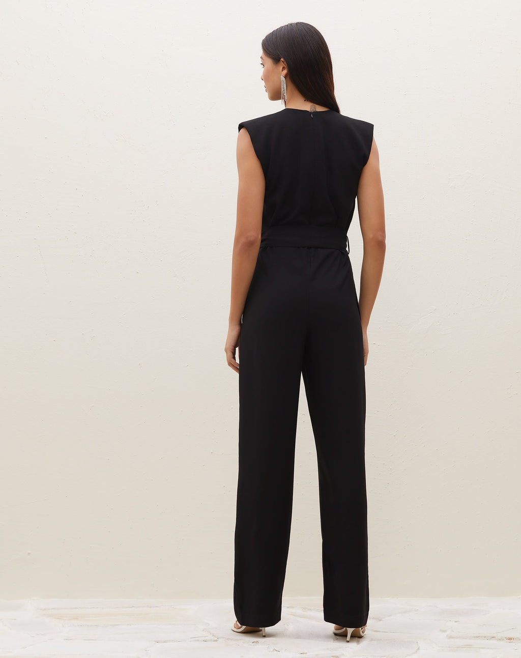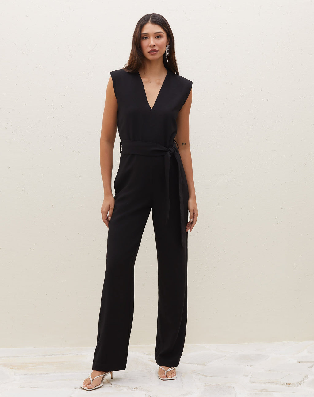 Destaque-se com elegância neste macacão de alfaiataria com faixa na cintura. Perfeito para o trabalho ou eventos noturnos, seu design clássico e acinturado garante um look sofisticado e versátil.
