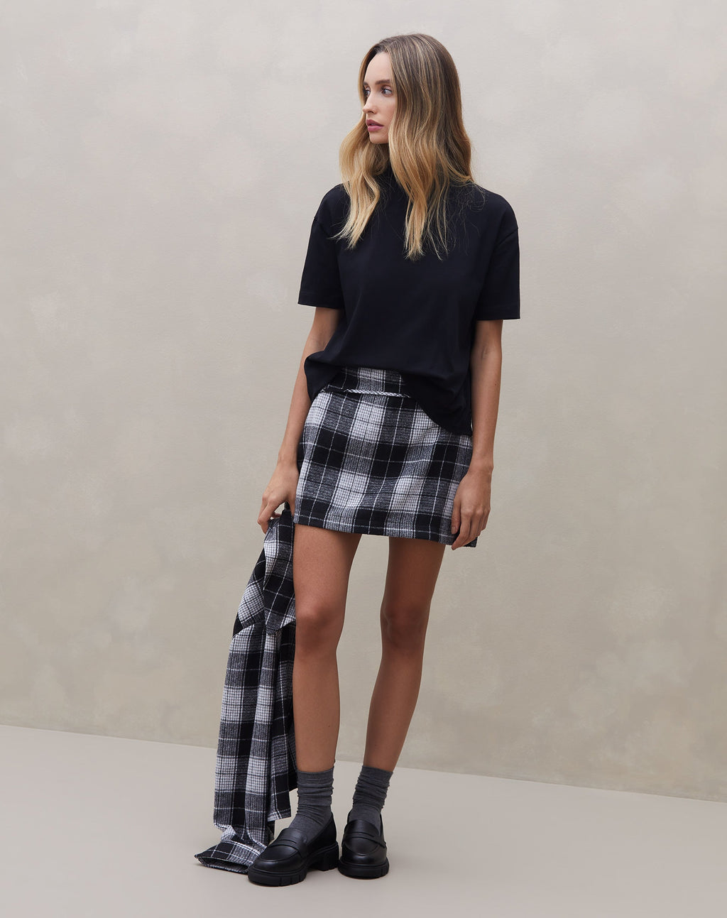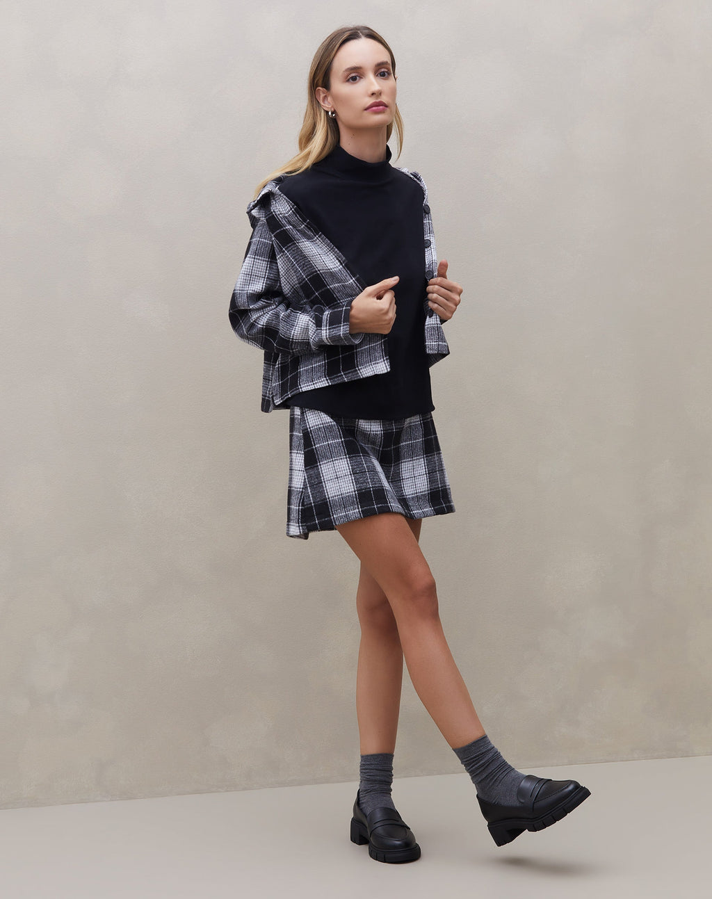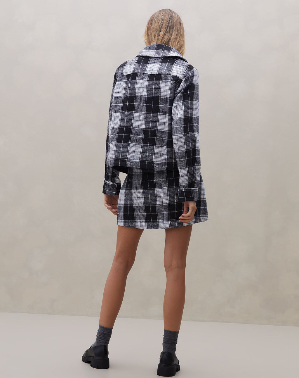 Mini saia com recortes em alfaiataria xadrez, perfeita para um look casual elegante. Destaque para o design alfaiatado e o comprimento curto, ideal para diversas ocasiões.