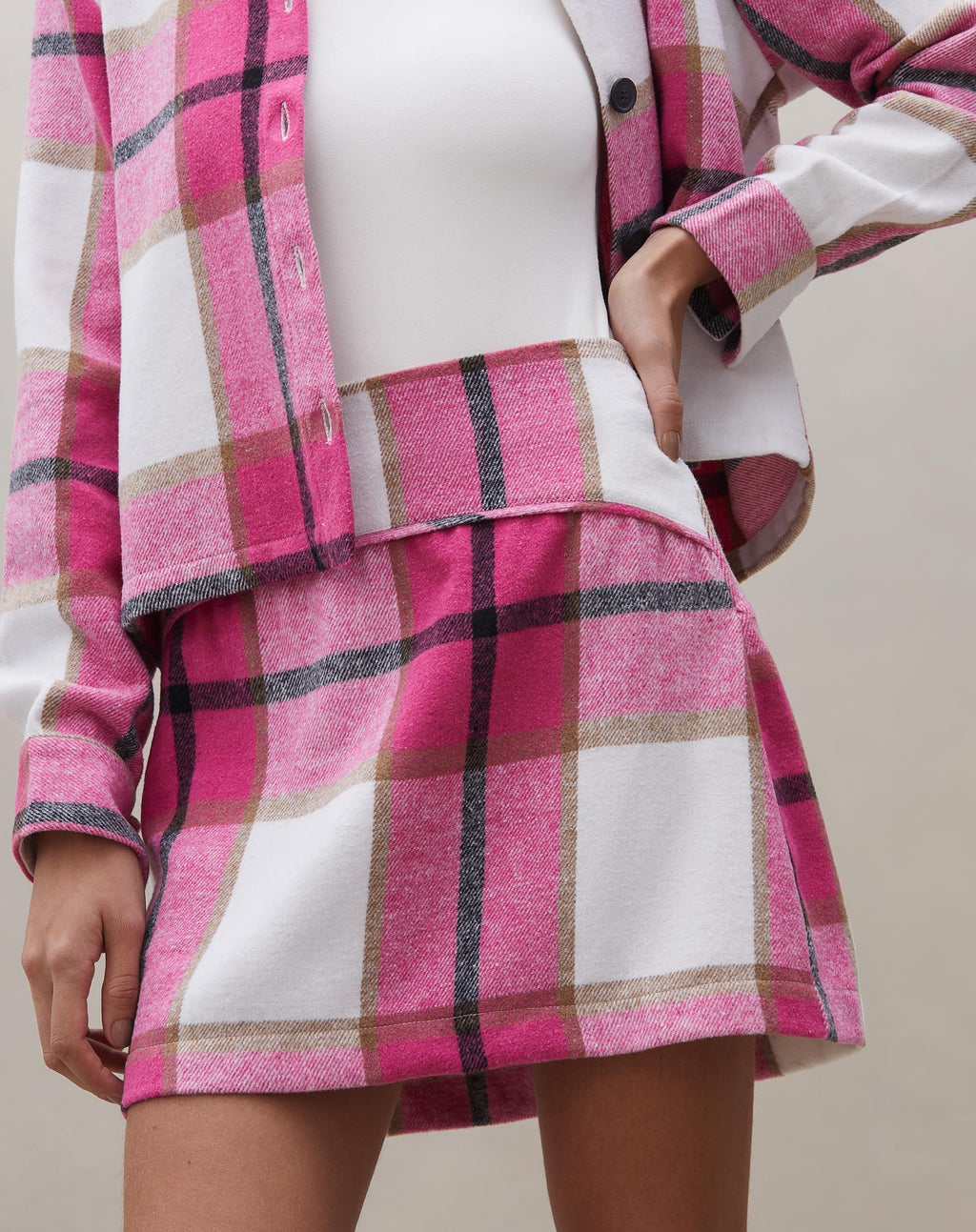 Mini saia com recortes em alfaiataria xadrez, perfeita para um look casual elegante. Destaque para o design alfaiatado e o comprimento curto, ideal para diversas ocasiões.