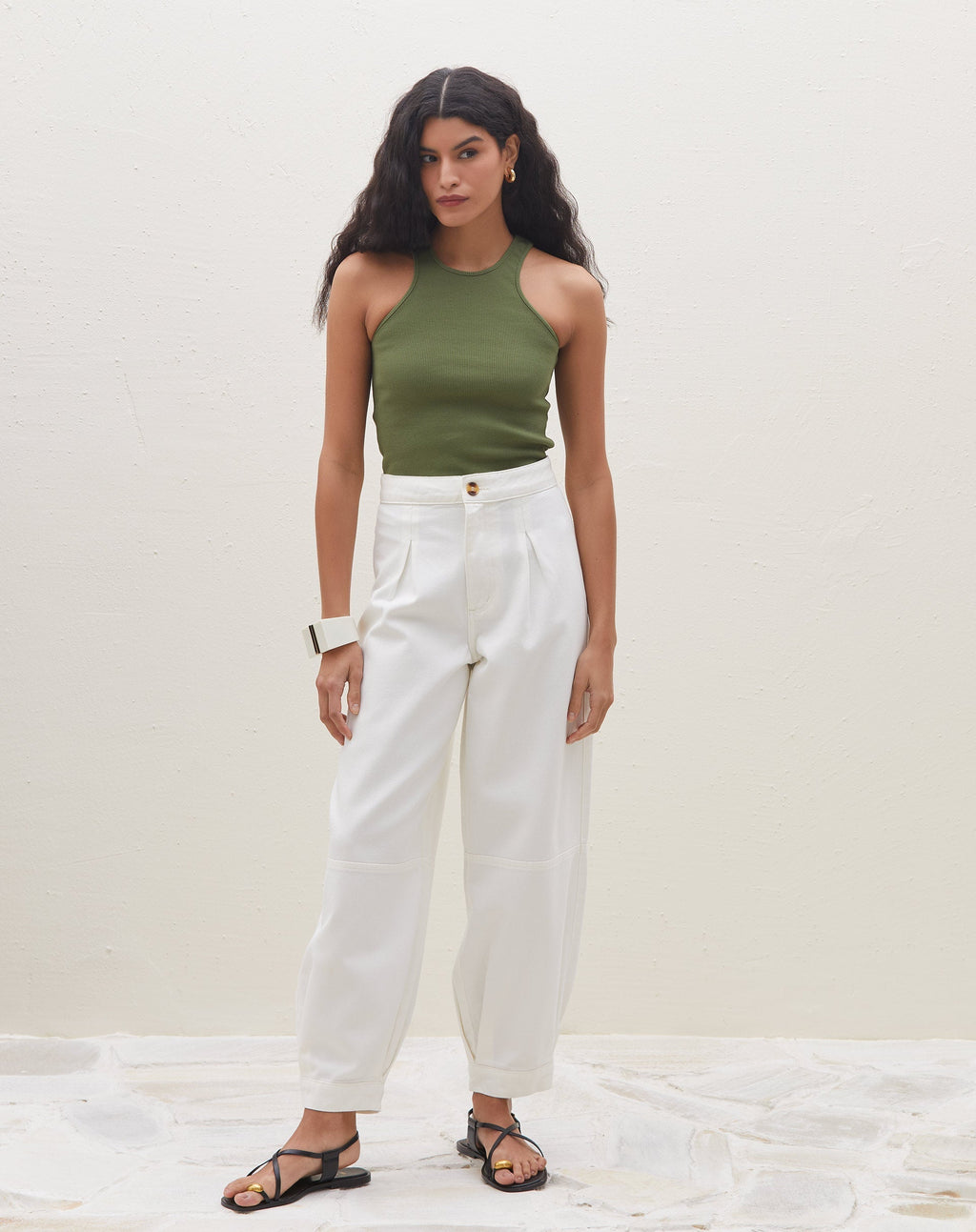 Regata decote halter de malha ribana, perfeita para um look casual chic. O design minimalista e a silhueta justa garantem um visual elegante e versátil.