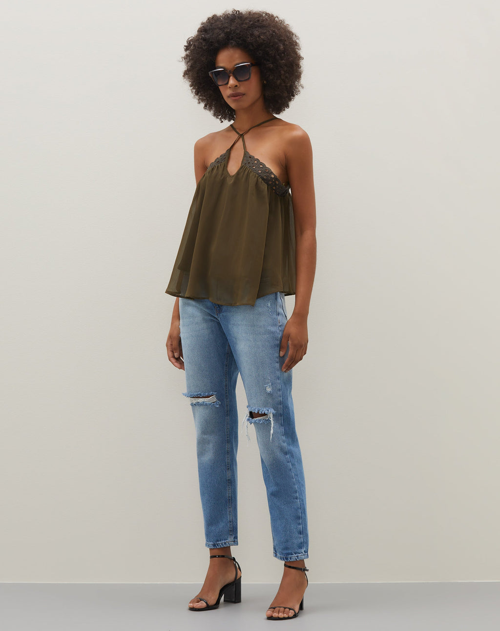 Adicione a Regata de Amarração com Renda no carrinho e ganhe elogios de brinde. Ela tem silhueta evasê, comprimento padrão e decote reto nas costas.