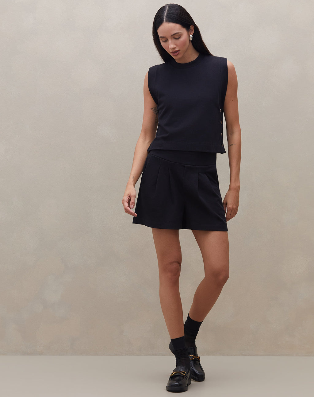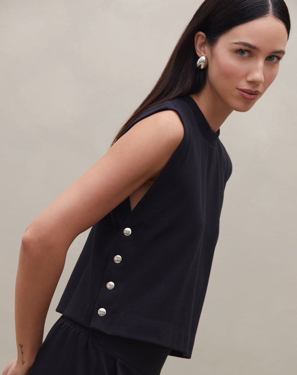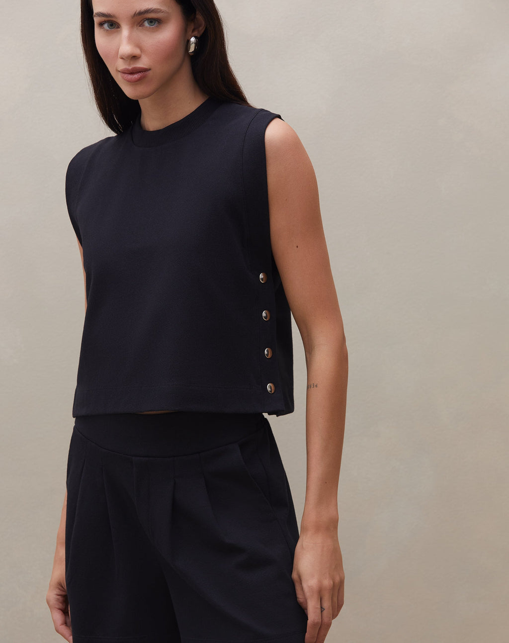 Uma peça versátil e moderna para o seu closet. A regata quadrada com botões de malha é perfeita para um look casual e descolado. Destaque-se com seu design único e confortável.