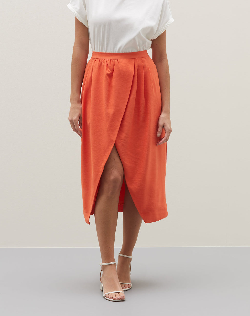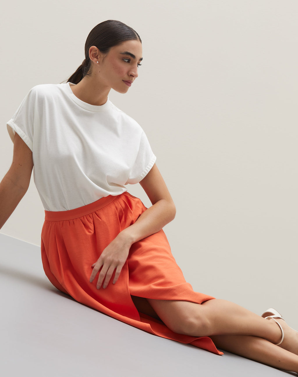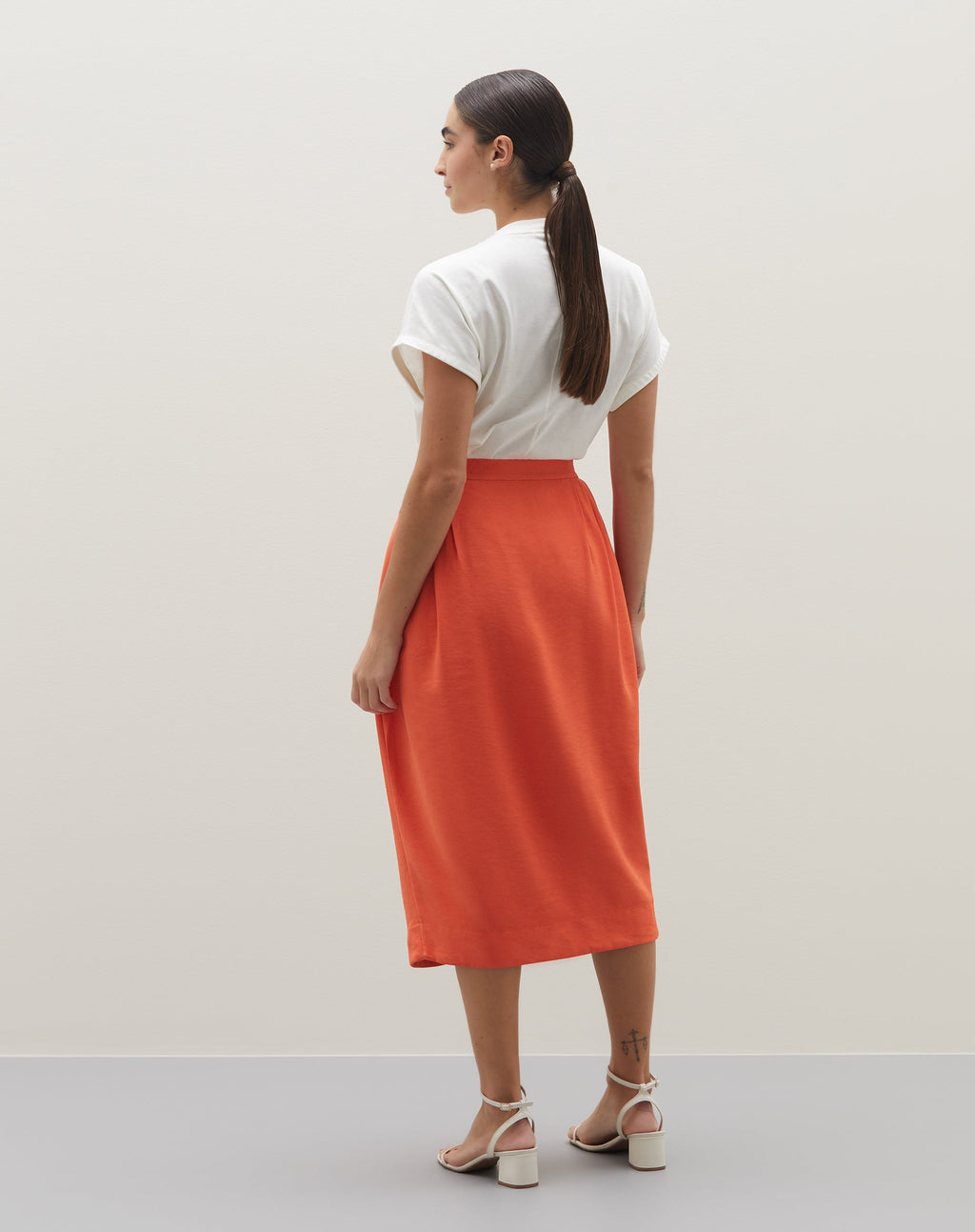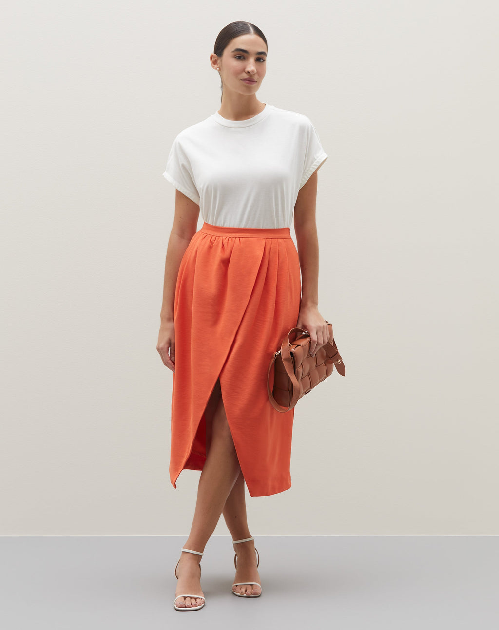 Saia Barra Afunilada Alfaiataria, uma peça statement para ocasiões casuais. O design alfaiatado e a cintura alta garantem um look elegante e moderno.