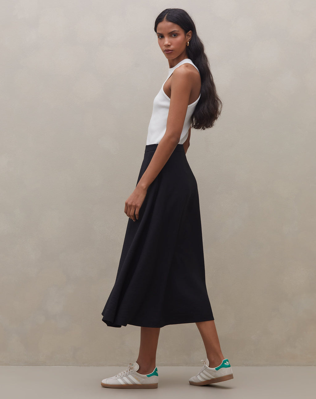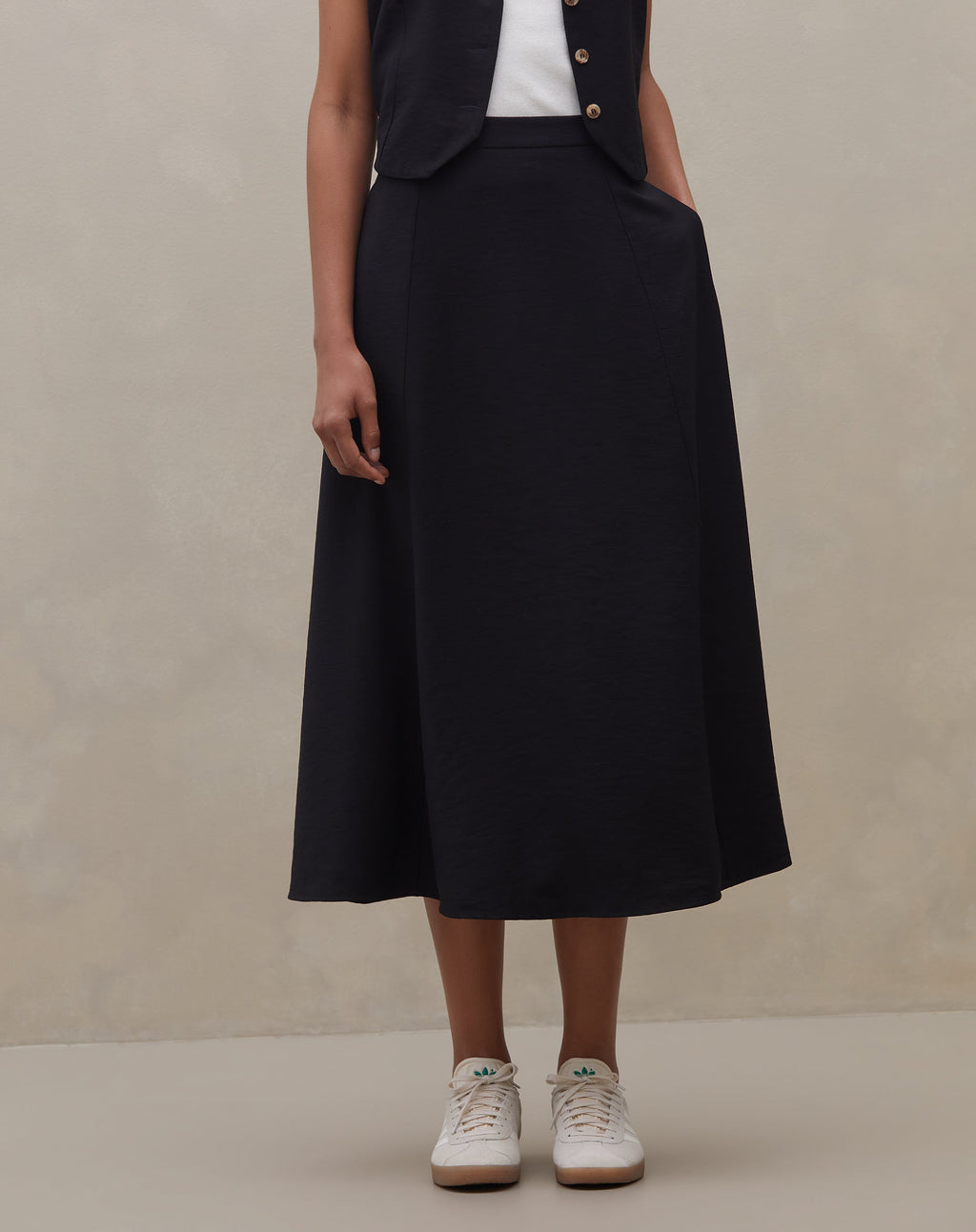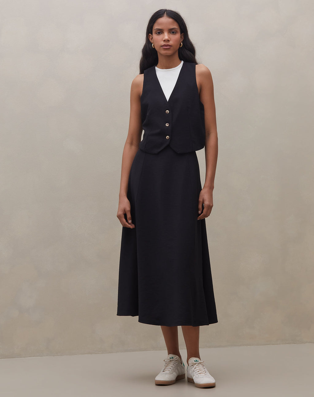 Uma peça elegante e versátil para o seu closet. A saia midi com recortes é ideal para looks de trabalho ou ocasiões casuais. Seu design alfaitado e cintura alta garantem um visual clássico e sofisticado.