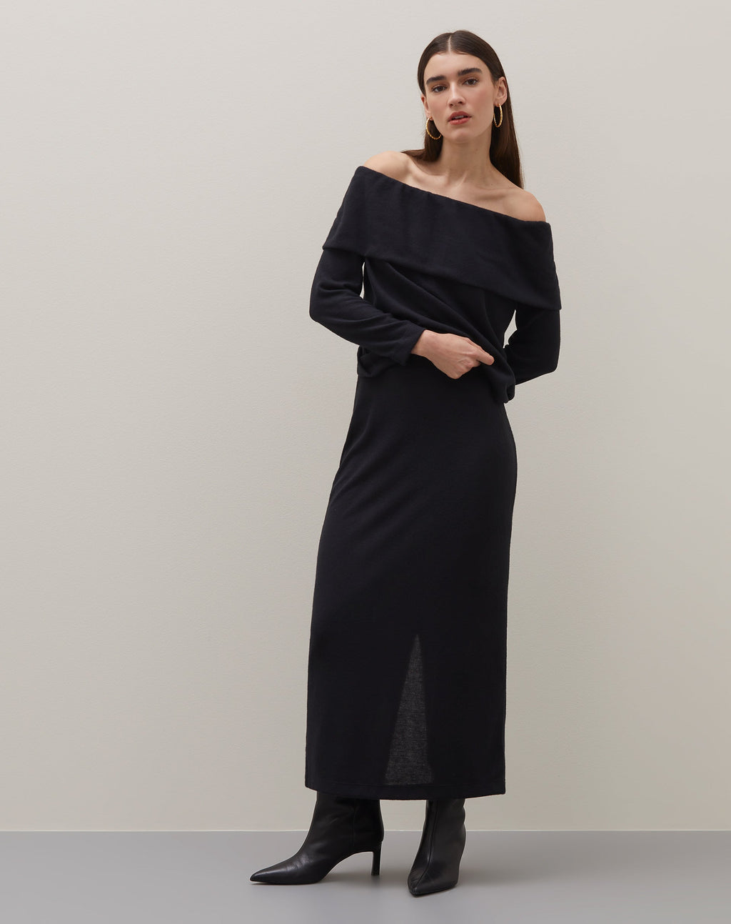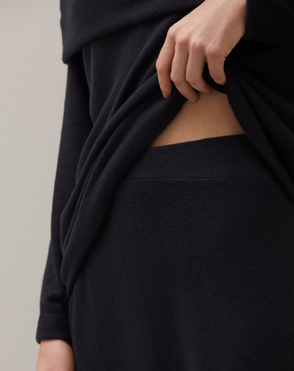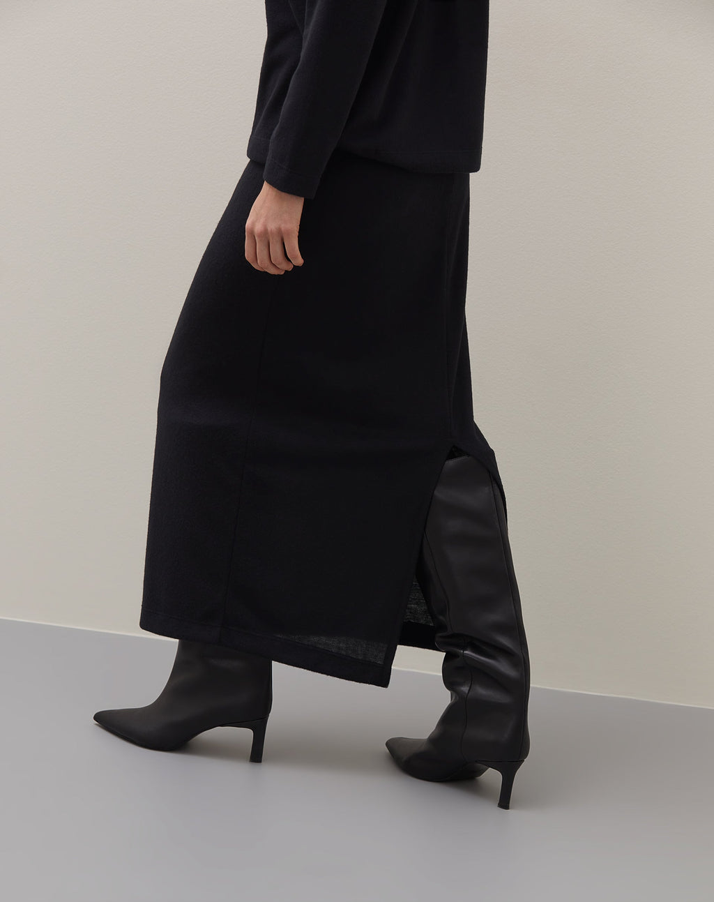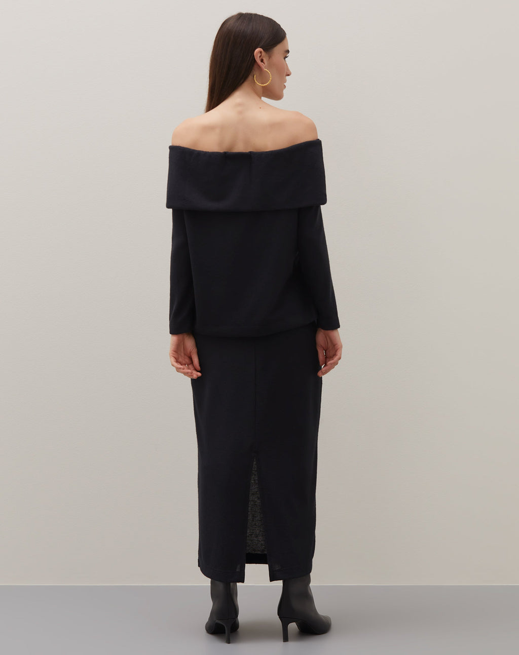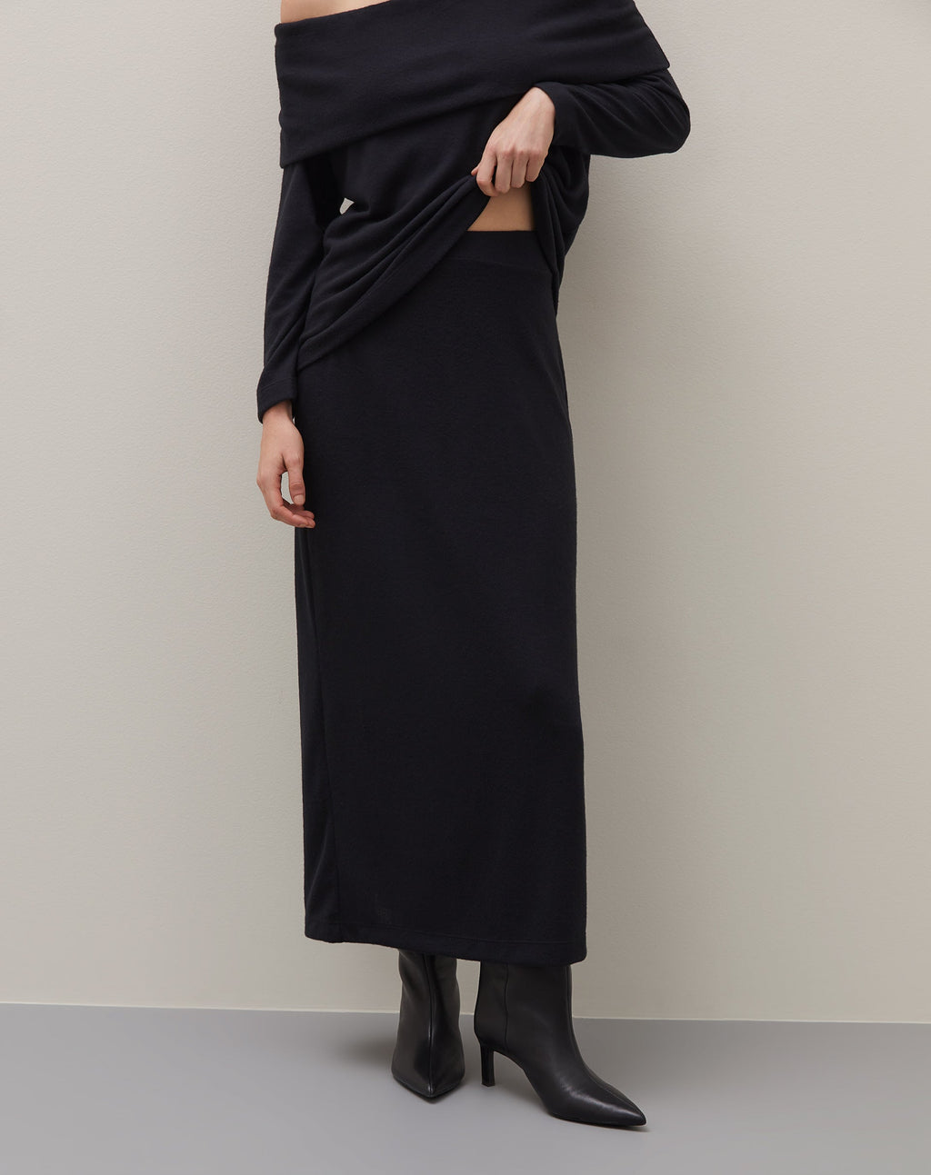 Saia midi tubo de malha, perfeita para um look casual elegante. Destaque para a cintura alta e o comprimento midi, garantindo um visual sofisticado e versátil.