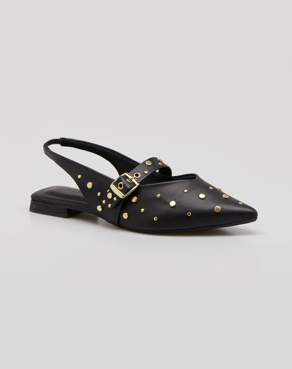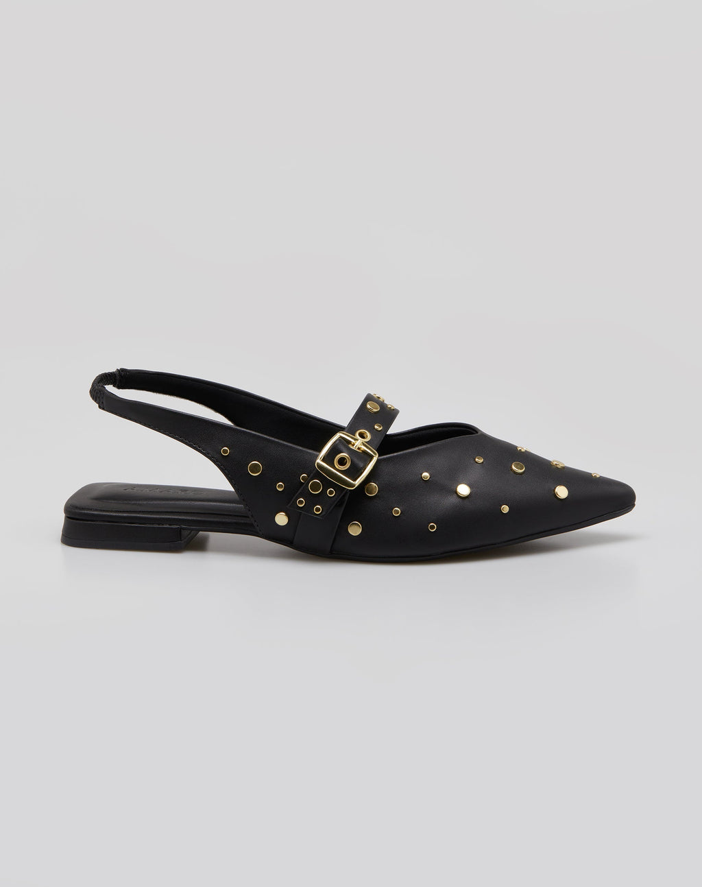 Deslumbre com elegância e modernidade usando nossa sapatilha slingback com aplicações. O design sofisticado e o bico fino tornam essa peça um item versátil para diversas ocasiões, do trabalho ao happy hour.